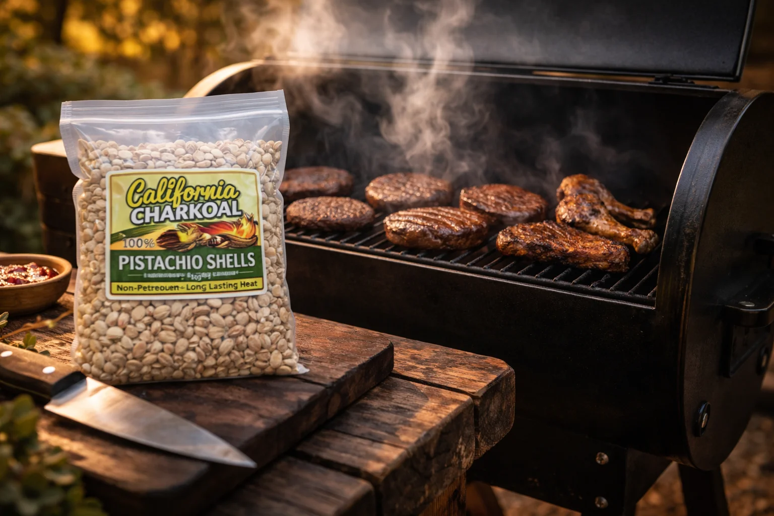 Premium BBQ fuel made from pistachio shells. Better flavor. Cleaner burn. Zero waste.